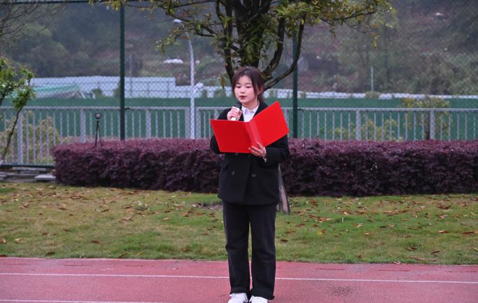 巴南校区,艺术与传媒学院2024级播音与主持艺术专业三班学生代表赵梓言进行发言,她分享了寒假返家乡实践的温暖经历:在社区公益课堂教孩子们剪纸,在少儿播音考级中参与志愿服务,在奉献中感悟青春价值。同时号召同学们将专业所学转化为服务他人的力量,把个人小梦想融入国家发展大蓝图,以勤学笃行的姿态践行“请党放心,强国有我”的青春誓言。