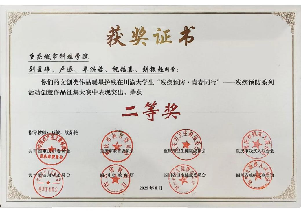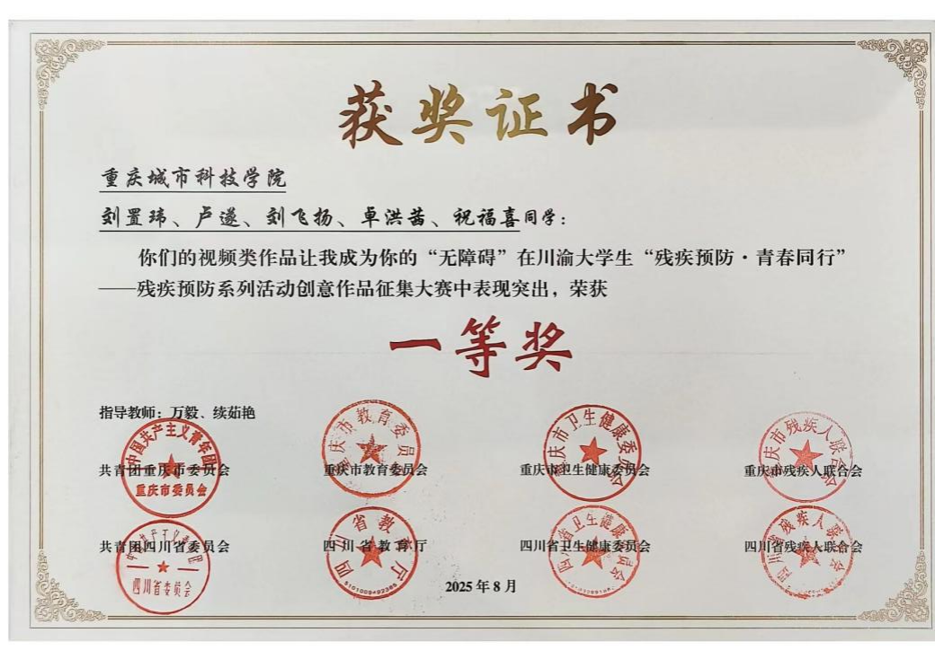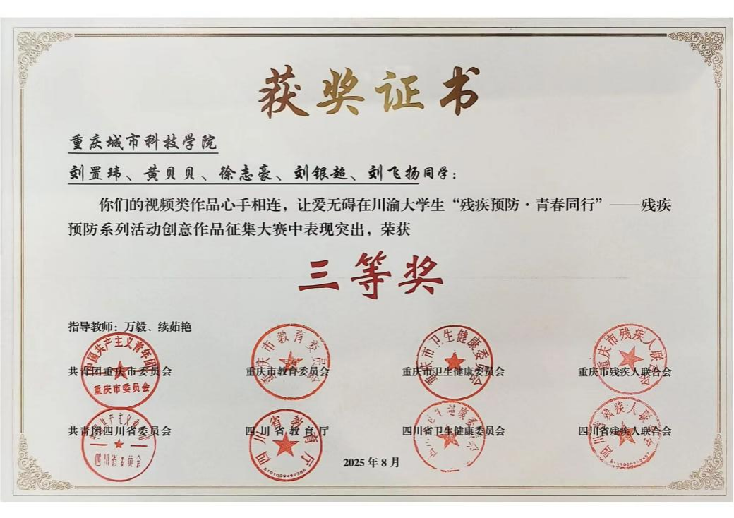 2025年8月,由共青团重庆市委员会、共青团四川省委员会、重庆市残疾人联合会、四川省残疾人联合会等8家单位联合主办的川渝大学生“残疾预防·青春同行”创意作品征集大赛圆满落下帷幕。近日传来喜讯,经过专家的严格评审与层层筛选,重庆城市科技学院学子在本次大赛中表现出色,多个类别作品脱颖而出并荣获奖项。其中,视频类作品《让我成为你的“无障碍”》《心手相连,让爱无碍》分别荣获一等奖与三等奖,文创类作品《暖星护残》荣获二等奖,充分展现了城科学子勇担社会责任、传递青春能量的精神风貌。
